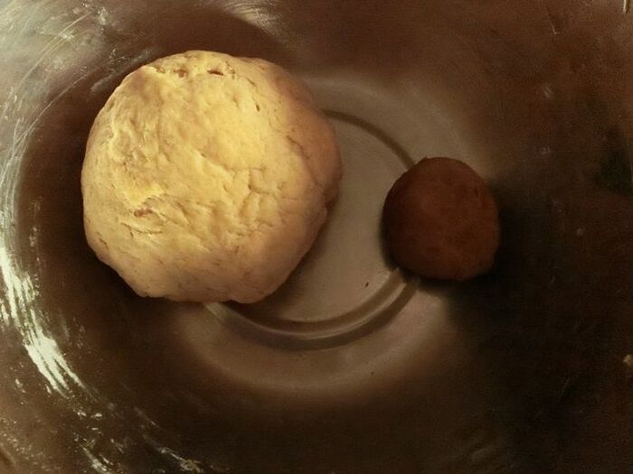 お湯、油を加えてよくこねたら、20g取り分けてココアパウダーを混ぜ合わせます。