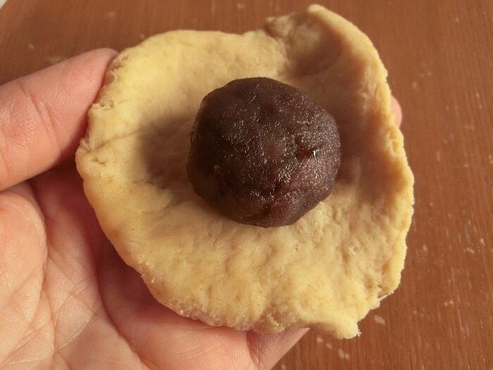 薄茶色の生地を8等分にして薄くのばしたら、市販のあんこを包みます。