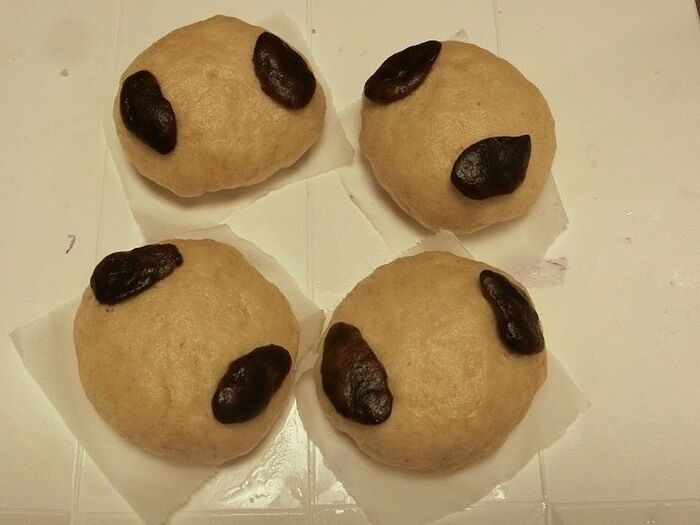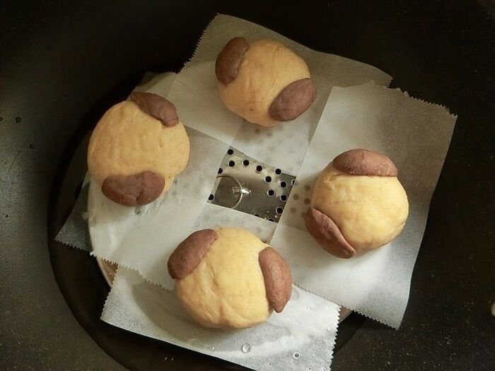 耳を作って顔の生地にしっかり付け、蒸し器で15~20分蒸します。