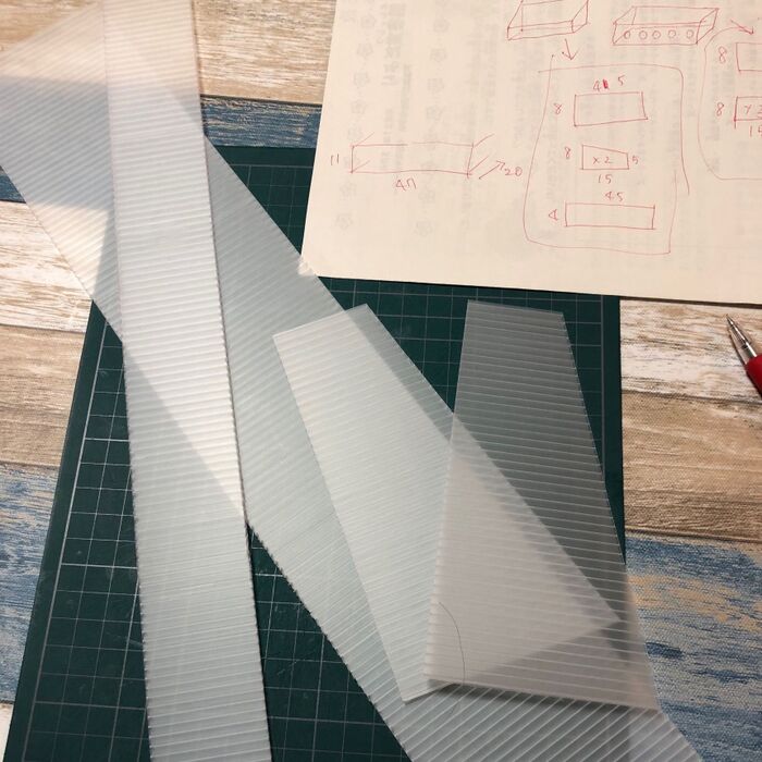 長さを図って収納したい場所より一回り小さめにプラダンで箱を作成。