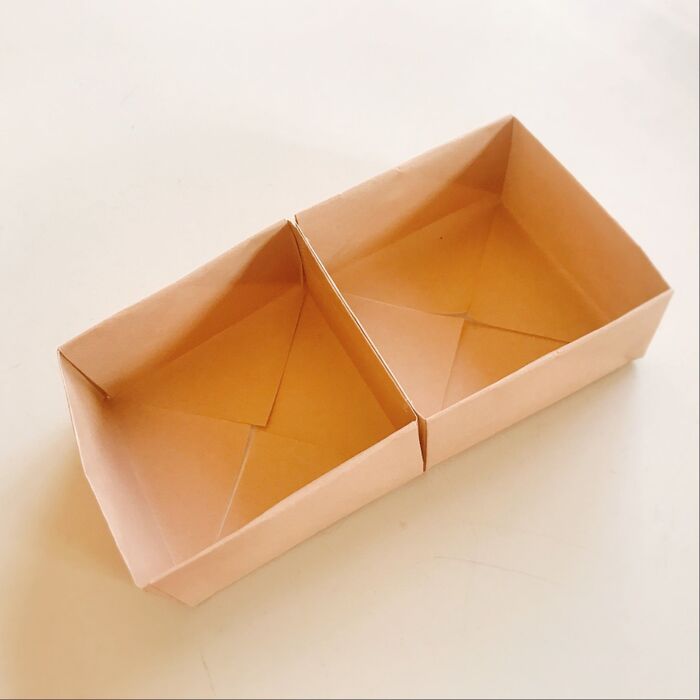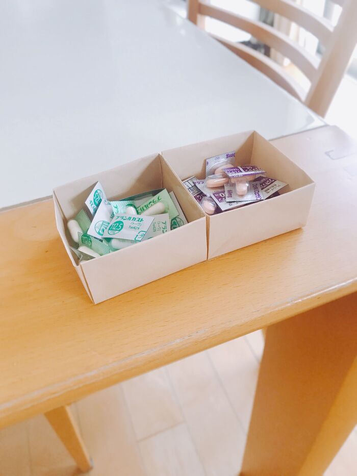 薬を入れているのは折り紙で作った2つの箱をテープでとめたもの。