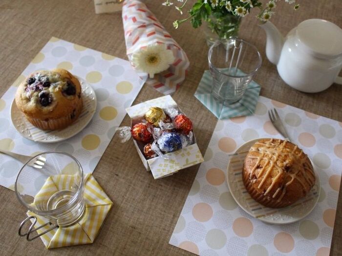 ↑で作ったコースターと、ただ普通に印刷したデザインペーパーをランチョンマットとして使えば、おうちカフェの完成です!