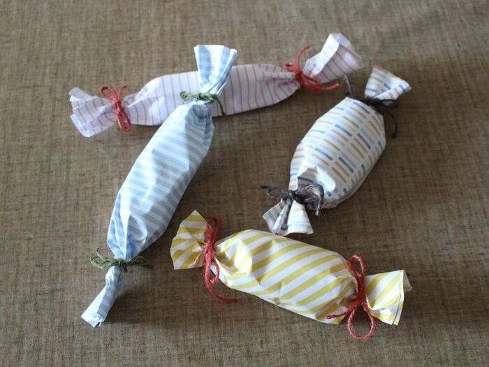 個装のお菓子をデザインペーパーで包み、端っこをねじり、麻ひもやリボンで結べば、
