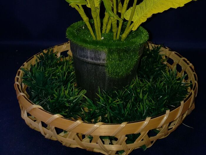 ⑤ 竹製の丸型のザルの中央に菜の花の鉢植えを細い針金等で固定する。