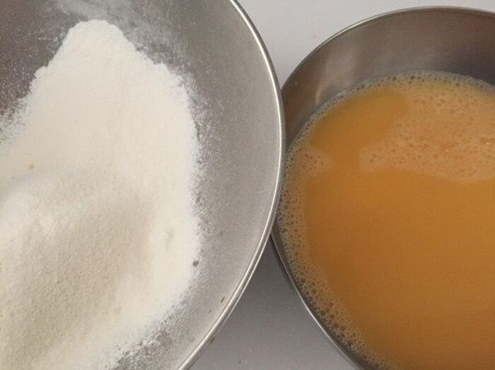 卵にだし汁を加えよくかき混ぜ ふるった粉を加えよく混ぜ合わせる