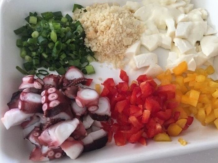 タコ モッツァレッラは1cm角ぐらいに切り 赤・黄パプリカ 青ネギは細かく刻む