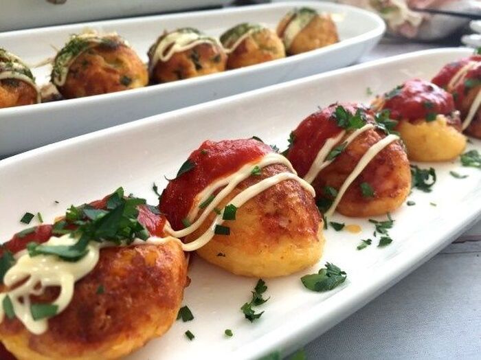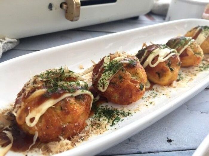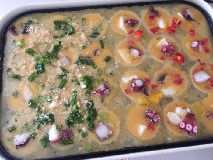タコ焼き器に オイルをひいて タコ焼きの生地を流し入れ具材をいれる