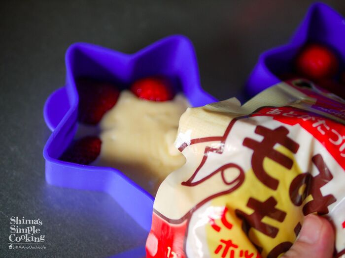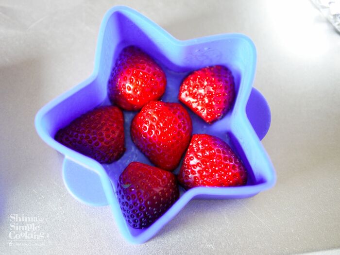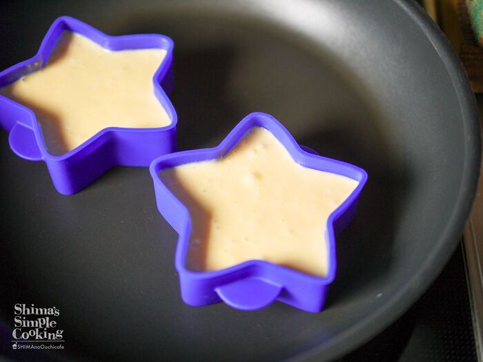 星形と同様にイチゴを並べ記事を8分目くらいの高さまで入れ、温めたフライパンに型をおき、蓋をして様子を見ながら弱火で焼きます。