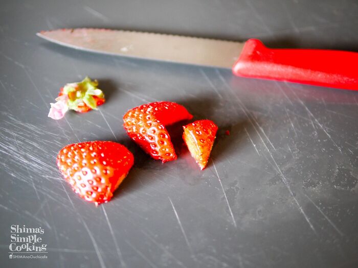 縦に半分に切ったイチゴにV字で切り込みを入れるだけ♪