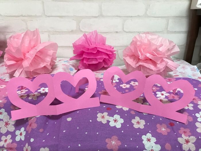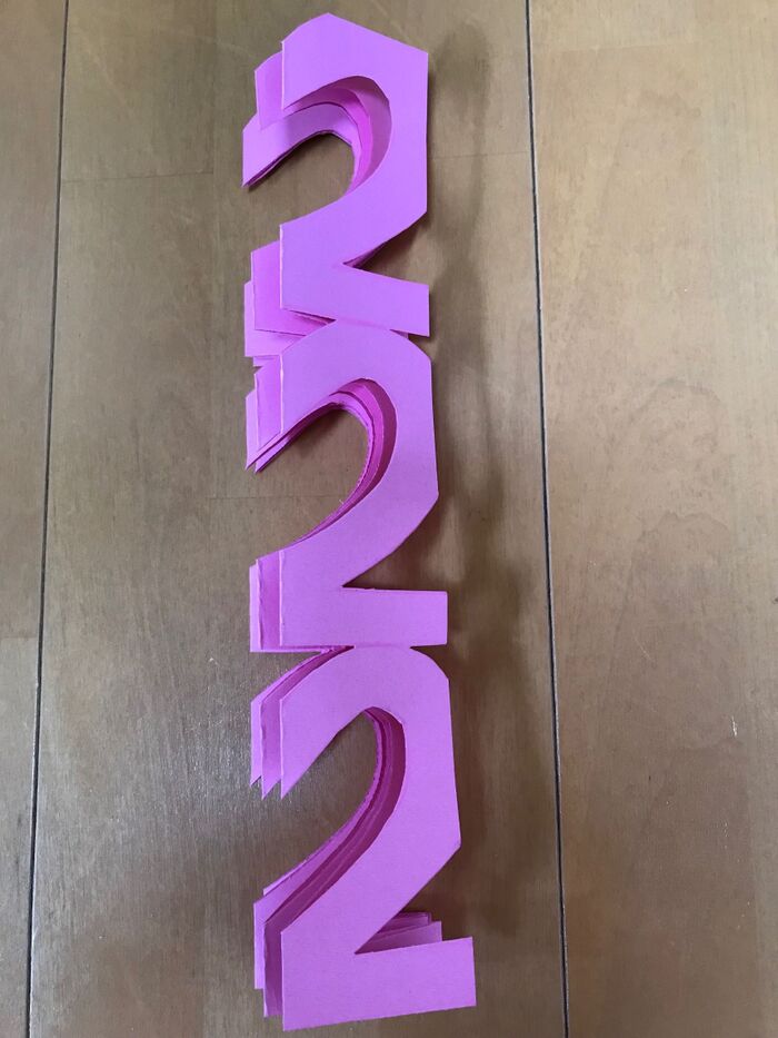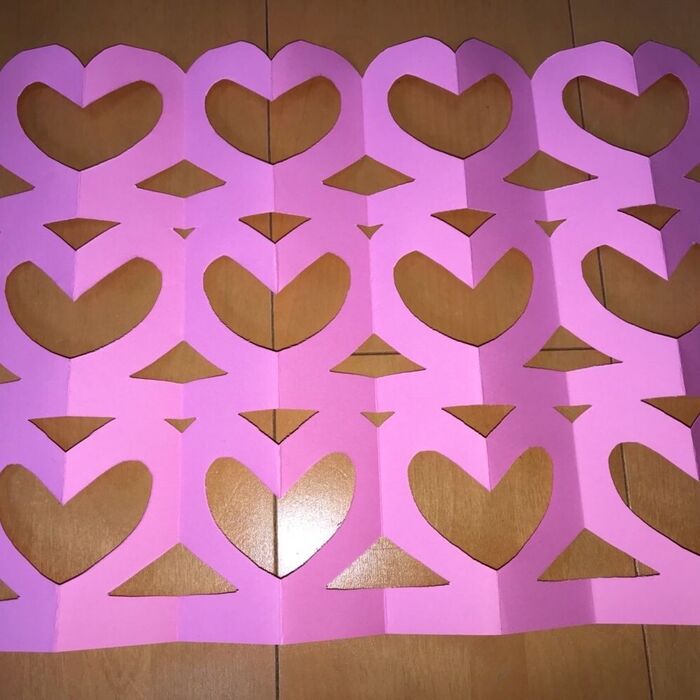 画用紙をジャバラに折り、2の形に切るだけ。広げると数字の「2」でできたハートが連なった形ができます。