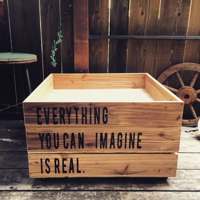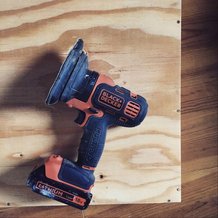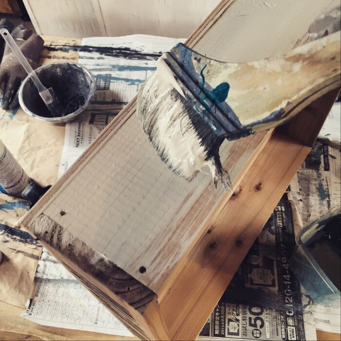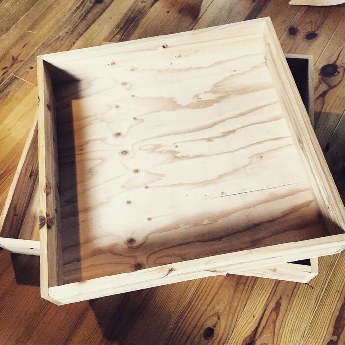 底の合板をかぶせるように置き、ビスで固定し、サンダーでやすり掛けをします。