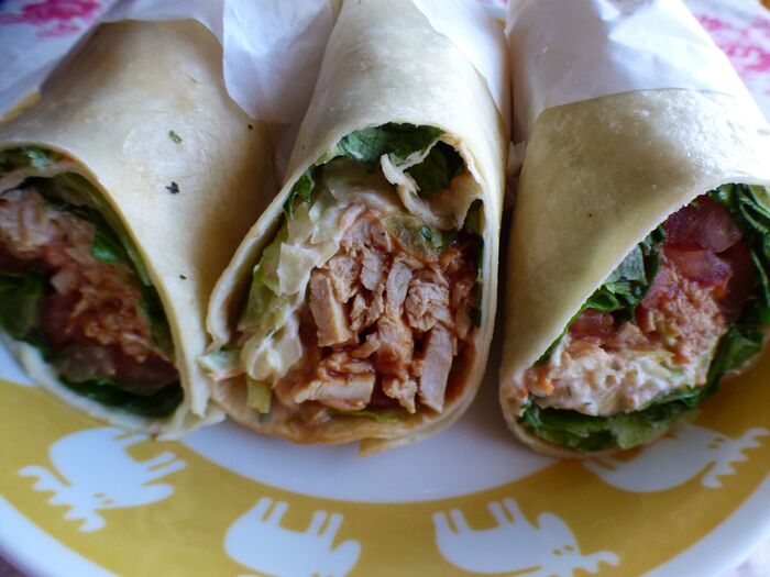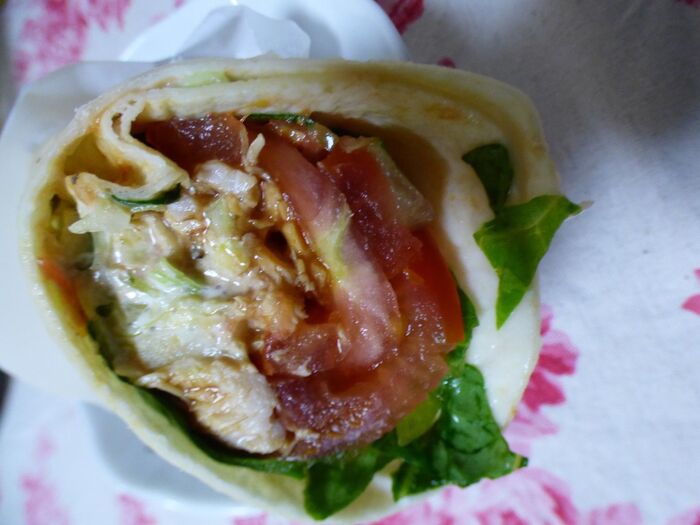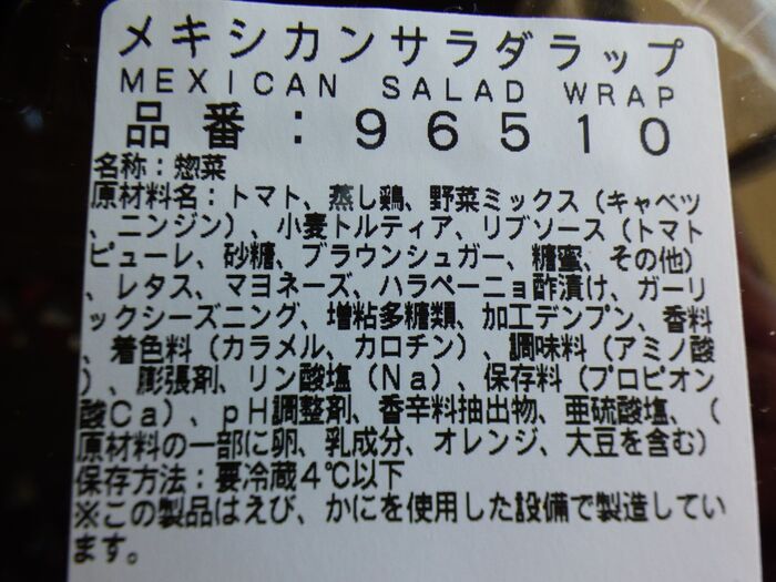 原材料名:トマト、蒸し鶏、野菜ミックス(キャベツ、ニンジン)、小麦トルティア、リブソース(トマトピューレ、砂糖、ブラウンシュガー、糖蜜、その他)、レタス、マヨネーズ、ハラペーニョ酢漬け、ガーリックシーズニング、増粘多糖類、加工デンプン、香料、着色料、調味料、膨張剤、リン酸塩、保存料、pH調整剤、香辛料抽出物、亜硫酸塩