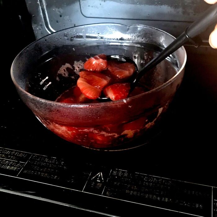1:耐熱の大きなボウルにいちご(粒が大きいものは、スプーンやナイフで半分にする)、メープルシュガー、レモン汁を入れざっくりと混ぜる。