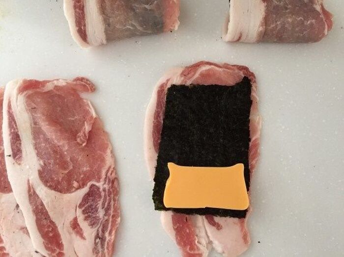 豚肉に軽く塩・コショウして 6等分に切った海苔とチーズ1切をのせる