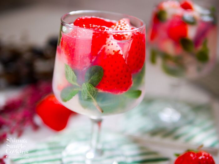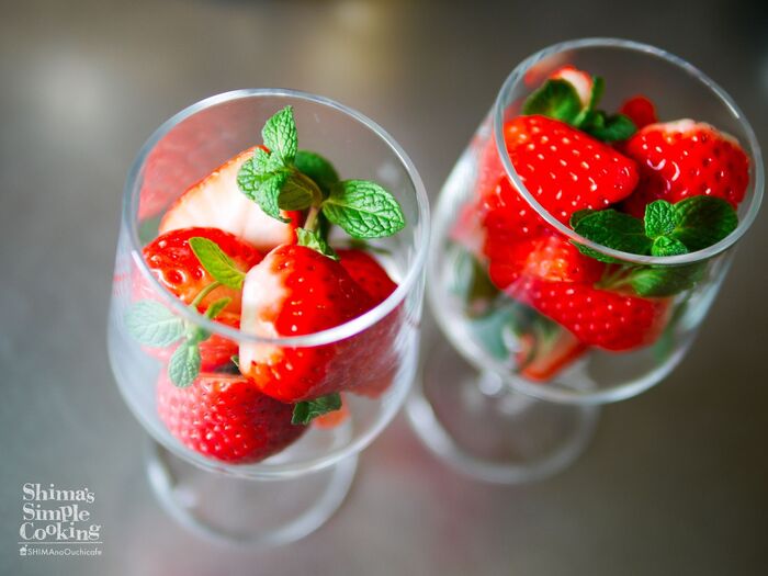 イチゴはヘタを取って縦半分に切り、グラスにミントと一緒にいれる。