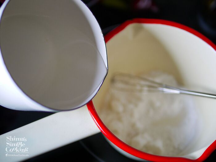鍋に砂糖、ゼラチン、水を入れしっかりと混ぜ火にかけ、沸騰したら火を止める。
