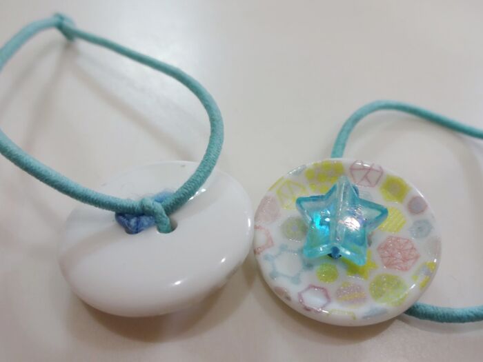 ボタンの穴を上手く利用して、ヘアゴムとビーズを固定してゆきましょう(^_-)-☆