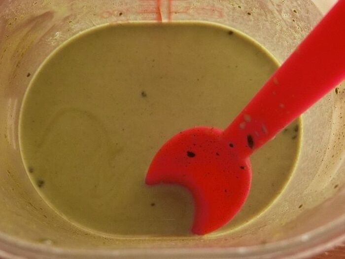 抹茶が溶けたら残りの牛乳と砂糖を混ぜ合わせ、生クリーム、ヨーグルトも混ぜ合わせます。