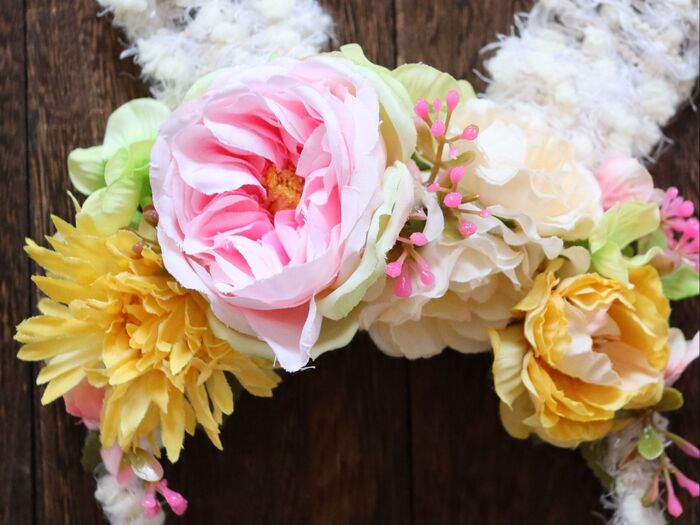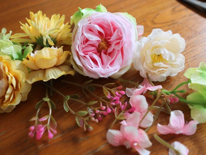 ポイントになる花や大きい花を先に付けるとバランスがとりやすいです。小花は隙間に差し込むように付けてください。