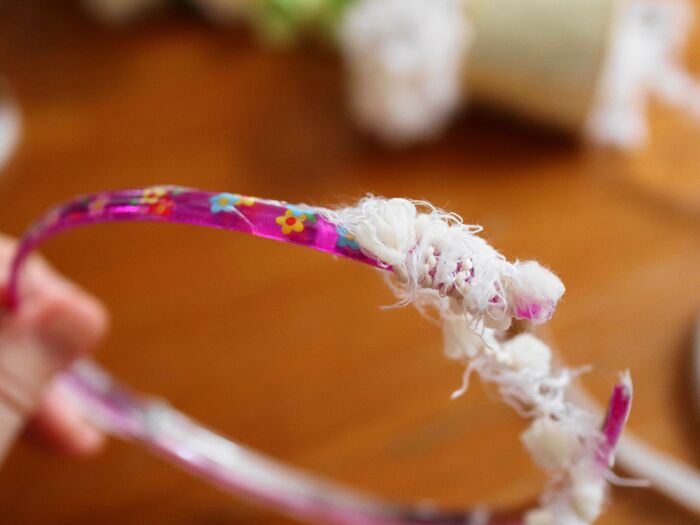 両面テープをカチューシャに貼り、毛糸を巻き付けていきます。