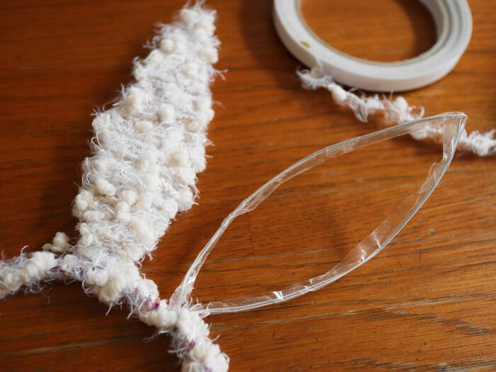 カチューシャに巻き付け終わったら、耳のワイヤーにも両面テープを貼り、毛糸を巻いていきます。