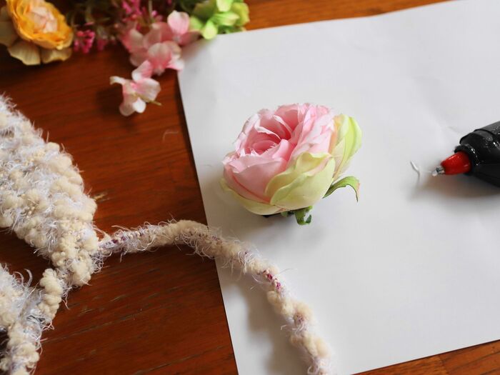 造花はセリアやダイソーで購入したものを使いました。両面テープがグルーも100均で取り扱いがあります。ワイヤーは家にあったものを使用しましたが、100均では色々なワイヤーがあるので使いやすいものを使用してください。