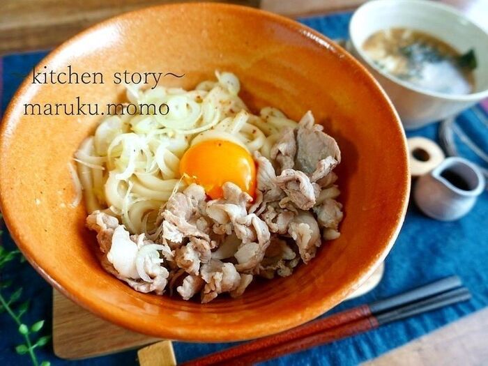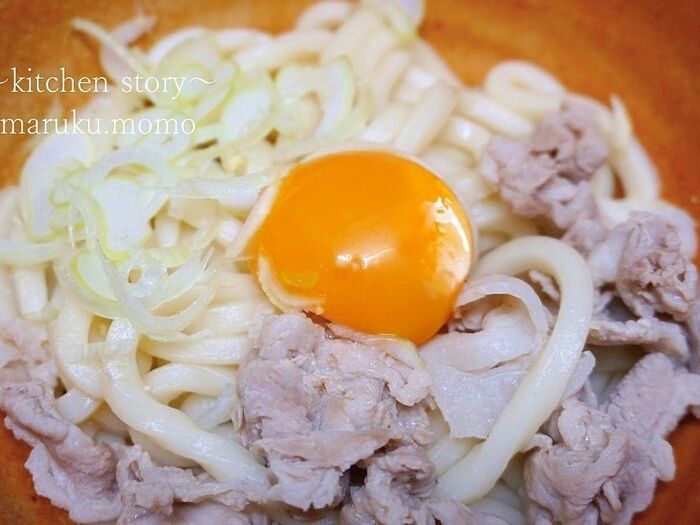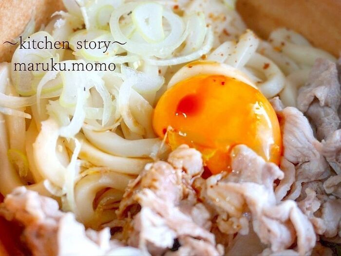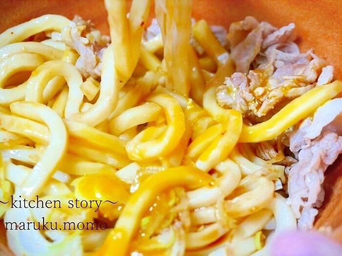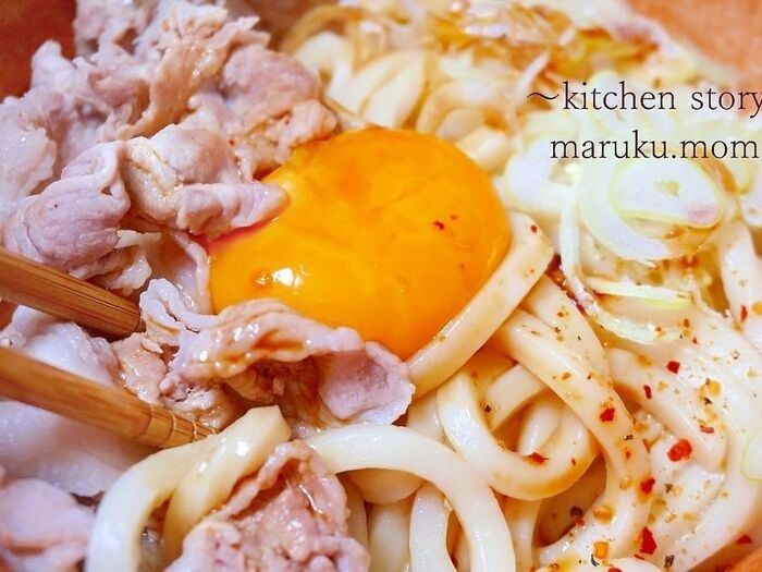 黄身が麺と豚肉に絡み濃厚で美味しくなりますね(*^v^♡♥)