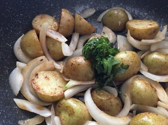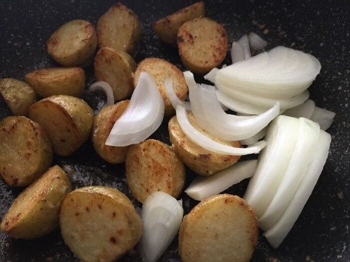 新玉ねぎは、少し厚めに切ってさっと炒めて 甘みを引き出し食感を残します。