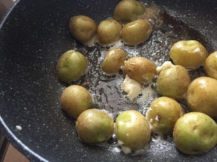 にんにくバターで、全体をカリッとするまで炒めるのがおいしさのポイントです。