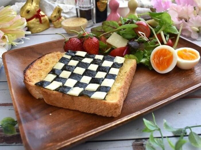 チーズが折れてしまったので 海苔を先にパンにのせてください。