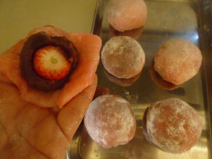【4】6等分にしたお餅を手のひらぐらいに伸ばしてあんこをのせ、苺をおしこめて包み込む。