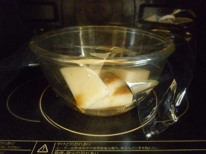 【1】切り餅と水、砂糖を入れて600wで3分間電子レンジにかける。