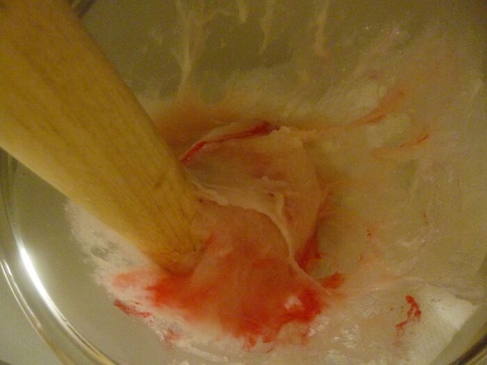 【2】食紅を入れて熱いうちに麺棒で混ぜ合わせる。片栗粉をふったまな板の上に混ぜたお餅をのせてひとまとめにし6等分に分ける。