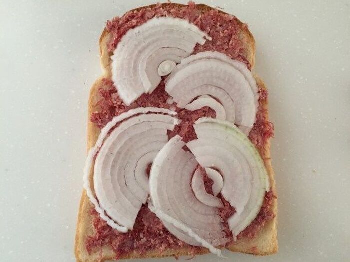 新玉ねぎは薄い半月切りにしてコンビーフの上にのせる