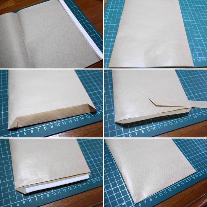 ①クラフト紙を横長に置き、片端を両面テープより少し幅があるくらいで折り、両面テープを貼る。