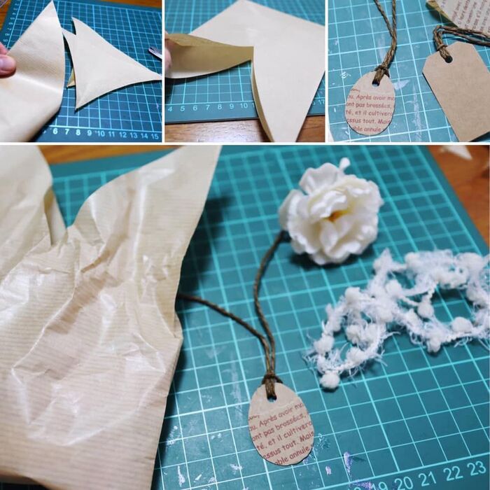 ⑨タグを卵型にカットし、英字のオーブンシートをのりで貼る。