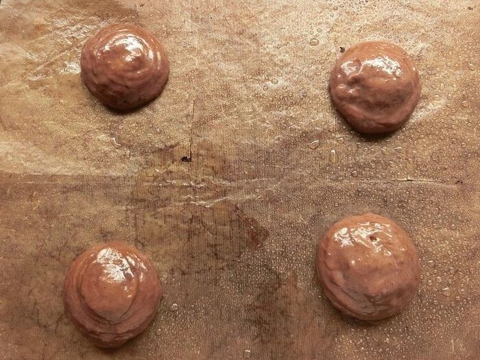 天板に生地を絞り出し、霧吹きをまんべんなくかけます。