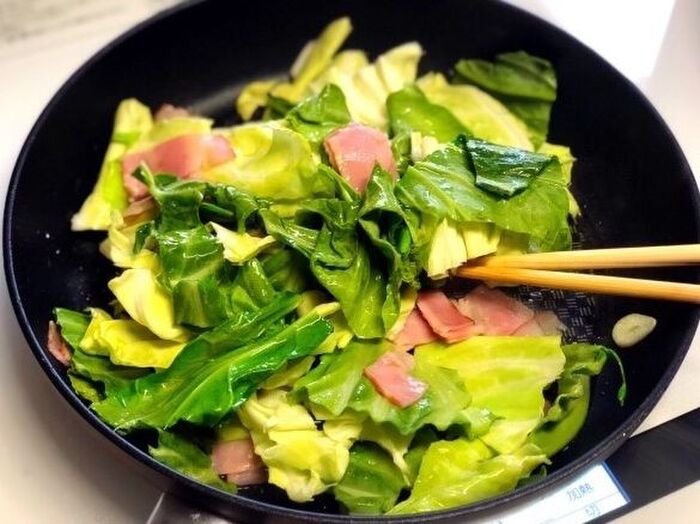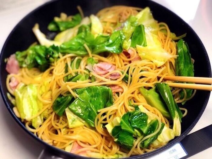 3.キャベツがしんなりしたらパスタと●を加え、さっとからめる。