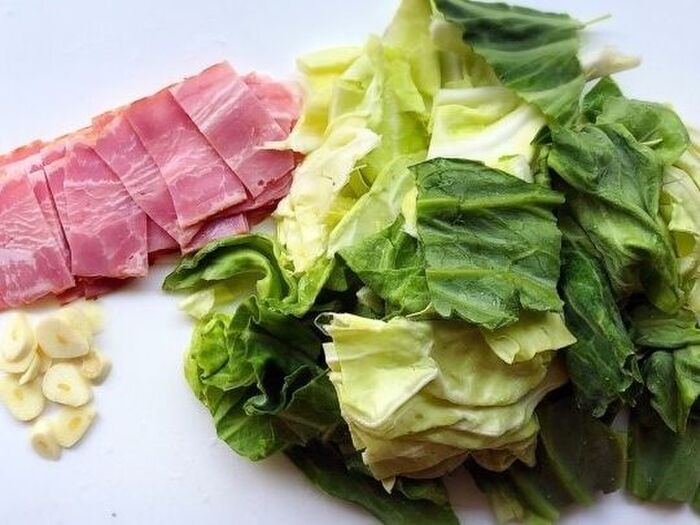 2.フライパンにオリーブオイル、にんにく、ベーコンを入れて中火にかける。にんにくの香りが立ったらキャベツも加えて更に炒める。