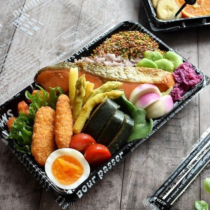 十穀米を右側に詰め焼いた甘塩鮭 茹でて外皮をとったそら豆
