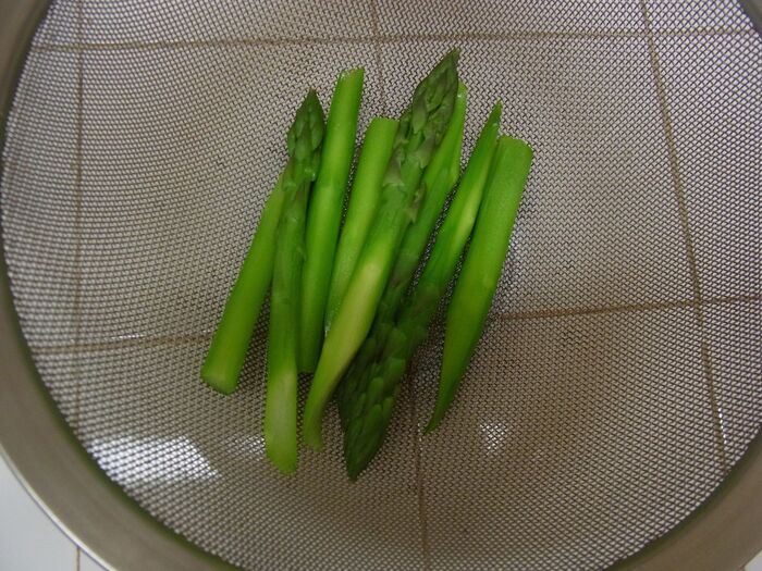 穴あきスプーンですくい上げて、ペーパータオルで水分を切ります。