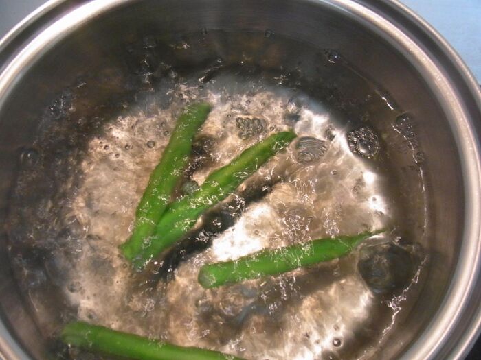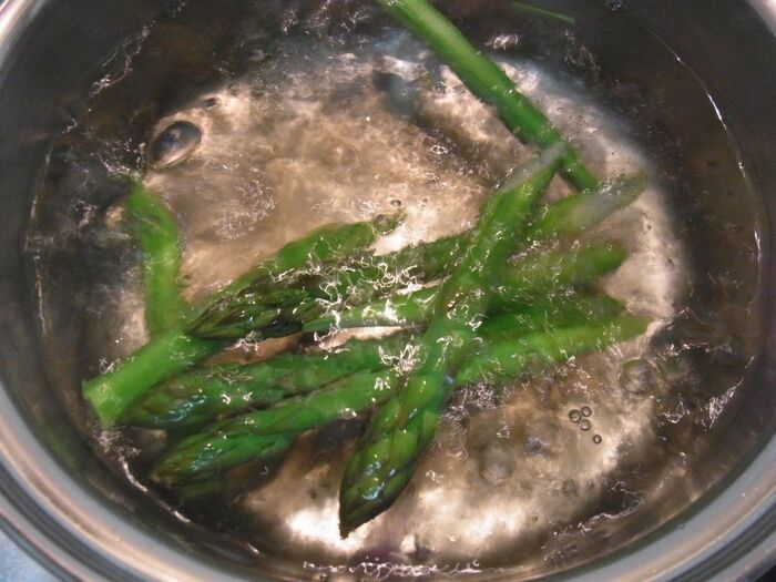 沸騰したお湯に、まず硬い下部の方を入れて30秒ほどしてから・・。