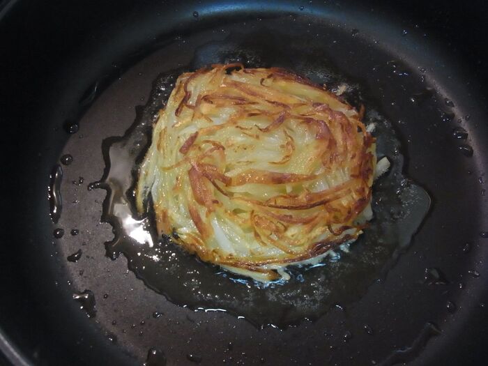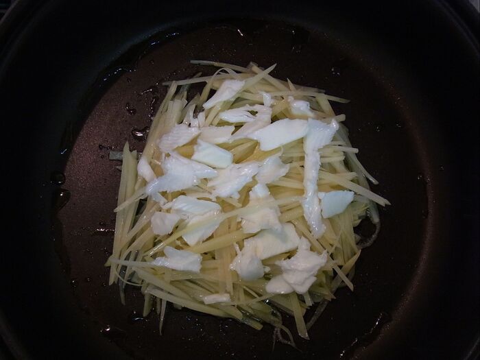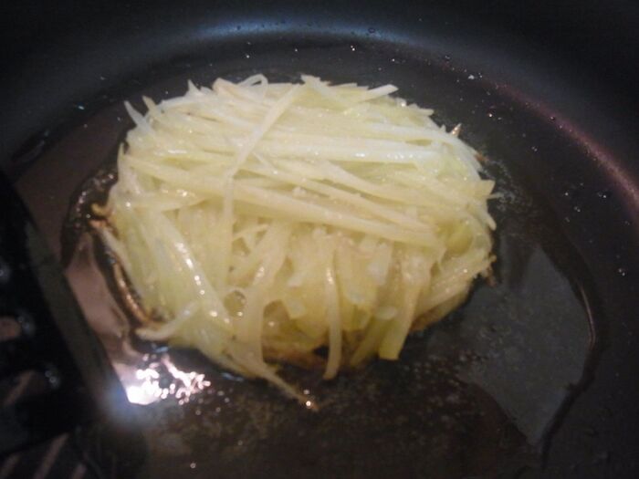 じゃがいものでんぷん質を利用して焼き固めるので水にはさらしません。