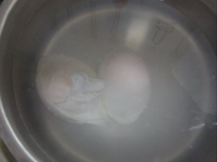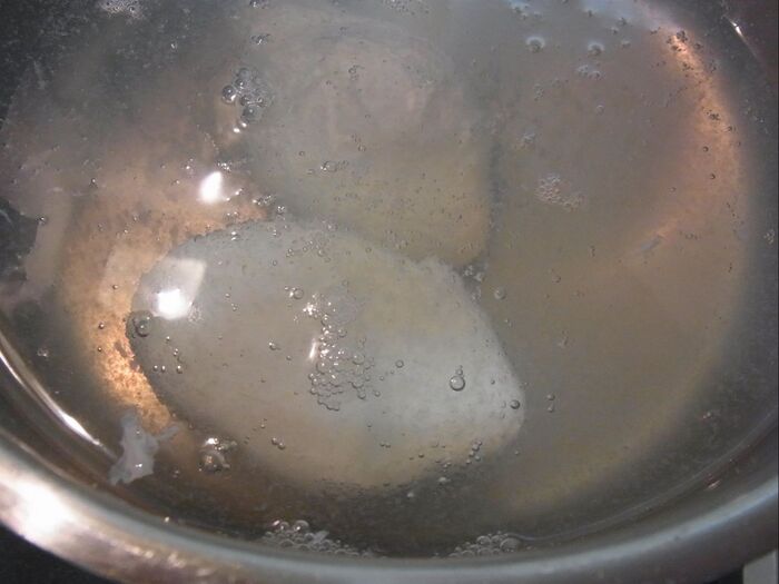 水様白身を取り除く。茹で湯に分量の酢と塩を加える。