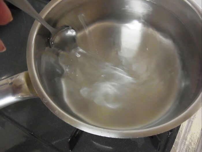 塩が溶けたら一旦火を止めて、湯をかき混ぜて小さな渦を作ります。