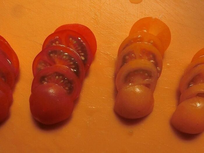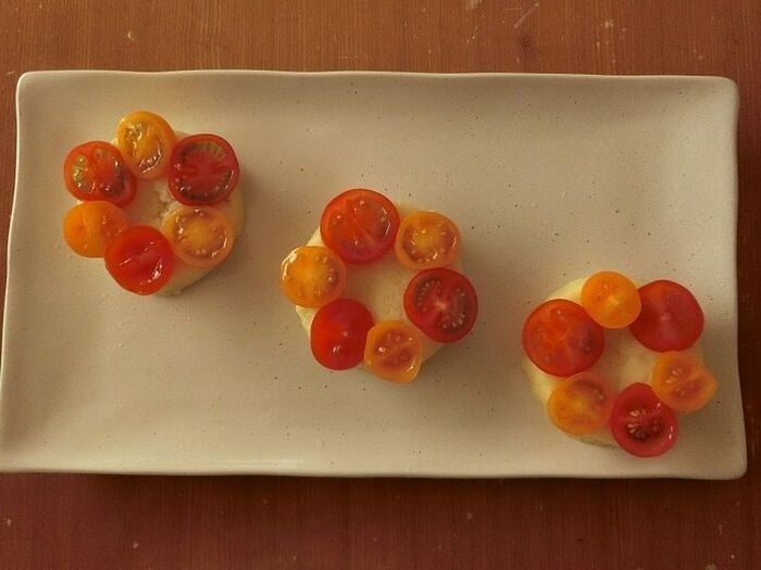 プチトマト4個は薄く輪切りにし、残りの2個は細かく切ります。