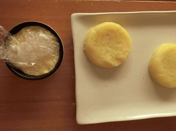 ひとまわり小さいカップにラップを敷いて3を入れ、5に乗せます。