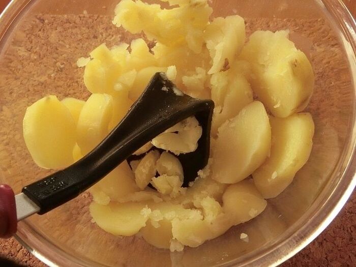 ふんわりラップをかけて電子レンジ600wで5分加熱し熱いうちにつぶします