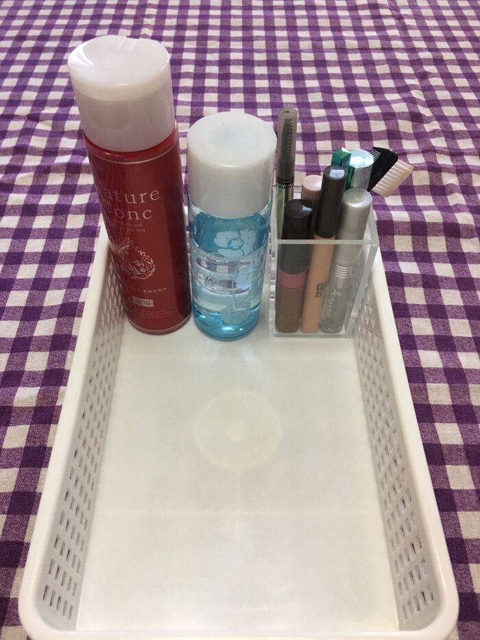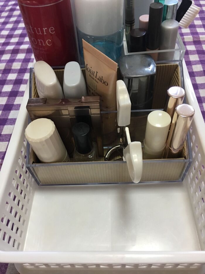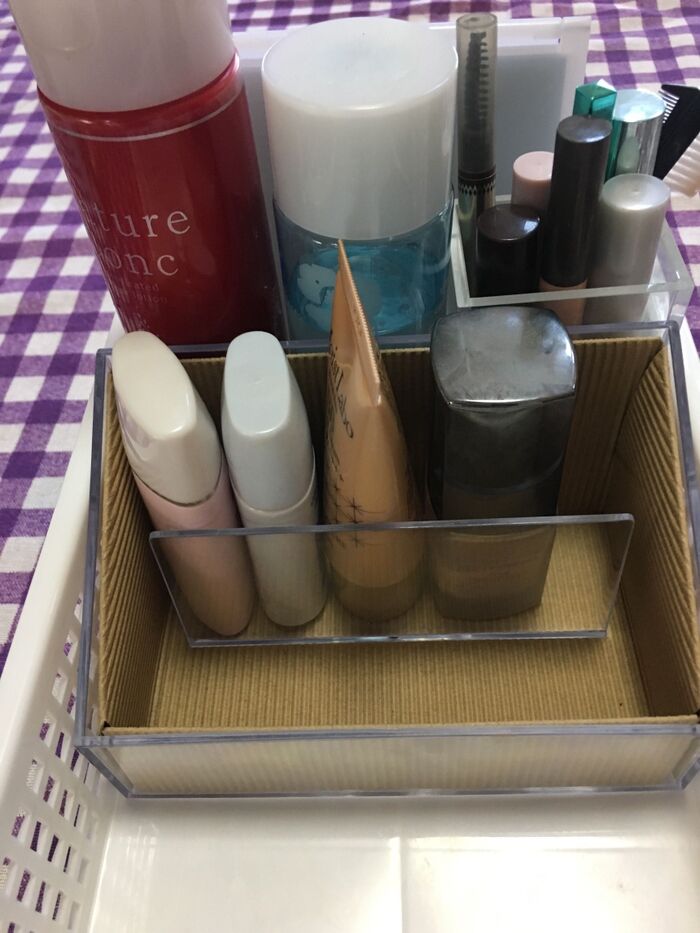 一番手前の空いているところにチークやクリームなど一番背の低いものを入れます。