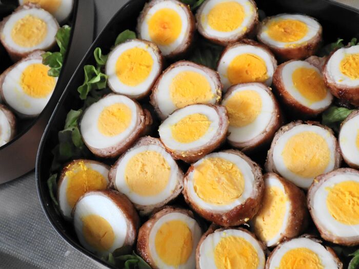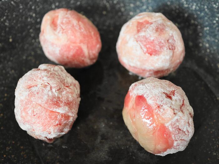 卵を茹でて殻を剥き、薄力粉をはたき、豚肉で全体を巻きます。